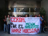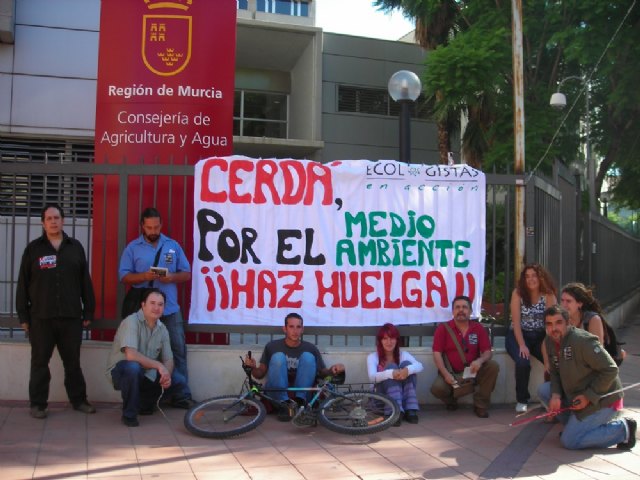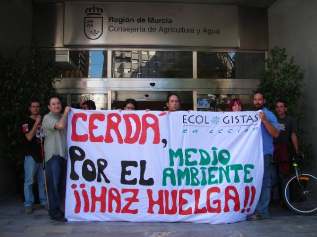 Durante la jornada de Huelga General, activistas de la asociación se acercaron a la Consejería de Agricultura y Agua (que actualmente tiene las competencias regionales de Medio Ambiente), donde desplegaron una pancarta en la que se podía leer: “Cerdá, por el Medio Ambiente ¡¡Haz huelga!!”. Con este acto simbólico la asociación pretendía criticar la nefasta política ambiental que lleva a cabo el ejecutivo regional, y sobre todo la Consejería de Agricultura y Agua que preside D. Antonio Cerdá. La Consejería “lleva años sin aprobar diferentes y muy necesarios planes de gestión ambiental, en algunos casos incumpliendo la legislación ambiental vigente”, afirmó Pedro Luengo, “razón por la cual Ecologistas en Acción ha presentado diferentes quejas y denuncias ante distintos organismos oficiales”.