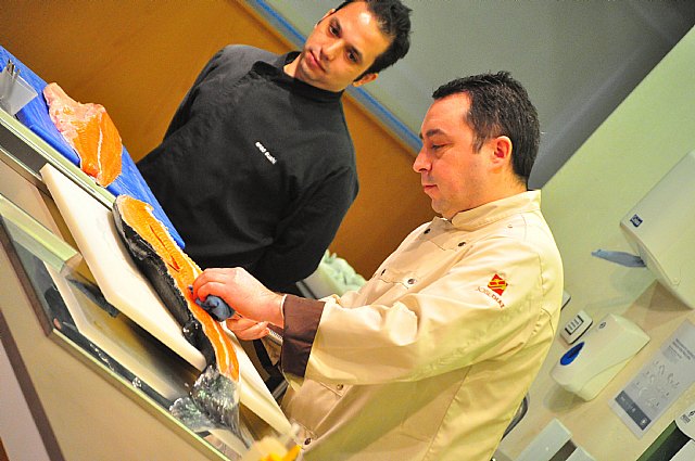 Patricio Alarcón, del restaurante Ensho Sushi, fue el conductor de una sesión práctica, en la que se elaboraron platos como maki sushi de atún rojo, maki sushi de huevas de pez volador con pepino, seshimi de salmón y atún,tataki de atún con salsa de cítricos y cebolleta y nigiri de salmón, entre otros. Al final de la jornada, organizada por el Centro de Cualificación Turística y Amureco, la Asociación de Jóvenes Reposteros y Cocineros de la Región de Murcia ofreció una degustación de los platos al público asistente.