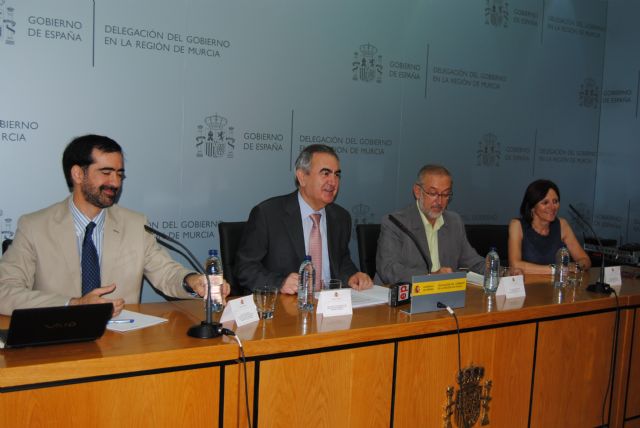 El director general de Sostenibilidad de la Costa y del Mar, Pedro Antonio Ríos, junto con el delegado del Gobierno en Murcia, Rafael González Tovar, la jefa de la Demarcación de Costas en Murcia, Francisca Baraza, y el catedrático de Oceanografía del Instituto de Hidráulica Ambiental de Cantabria, Raúl Medina, ha presentado esta mañana un estudio integral sobre la problemática de las playas de la zona del Mar Menor.