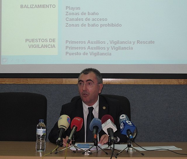 El consejero de Presidencia, Manuel Campos, presentó hoy los datos del balance de actuaciones desempeñadas hasta el momento en los 160 kilómetros de playas vigiladas del litoral de la Región de Murcia con motivo del dispositivo de vigilancia del Plan Copla 2011.