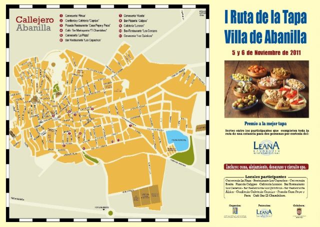 Con el coste de 1,5 € por tapa acompañada de su caña, vino o refresco, daremos a conocer nuestra gastronomía y nuestro pueblo. Habrá premio a la mejor tapa y para todos los ruteros-taperos que completen el recorrido podrán optar al sorteo de una estancia para dos personas en el BALNEARIO MEDICINAL LEANA, que incluye cena, habitación doble y circuito SPA.