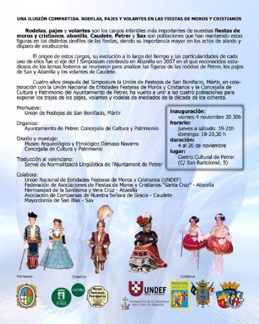 La Federación de Asociaciones de Fiestas de Moros y Cristianos "Santa Cruz" de Abanilla y la Hermandad de la Santa Cruz, colaboran en la exposición de Rodelas, Pajes y Volantes promovida por la Unión de Festejos San Bonifacio Mártir de Petrer. Cuatro años después del I Simposium de Pajes, Rodelas y Volantes celebrado en Abanilla, la Unión de Festejos, la Unión Nacional de Entidades Festeras de Moros y Cristianos (UNDEF) y el Excmo. Ayuntamiento de Petrer vuelven a unir a cuatro poblaciones para exponer los trajes de Rodelas, Pajes y Volantes.