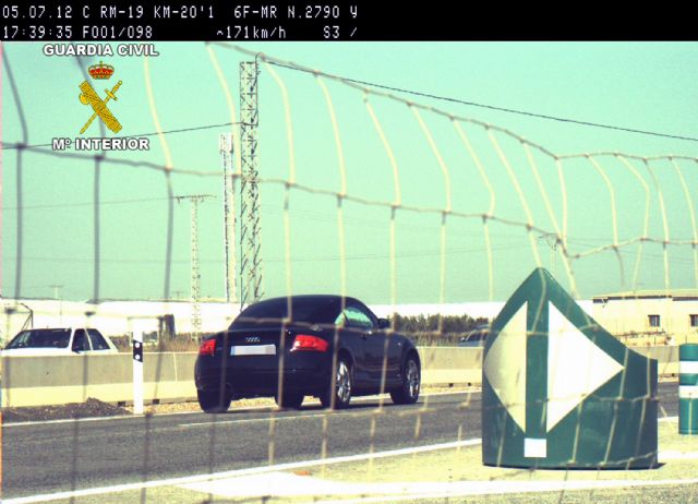 La Guardia Civil de la Región de Murcia dentro de los servicios enmarcados en la campaña de Seguridad Vial establecida para el control de velocidad, detuvo la tarde del pasado jueves, día 05, a un conductor por conducir un vehículo a motor a una velocidad de 171 Km/hora por la vía RM-19, en término municipal de Torre Pacheco, duplicando su velocidad máxima permitida.