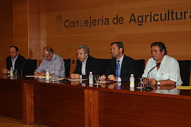 El consejero de Agricultura y Agua, Antonio Cerdá, firmó hoy un convenio de colaboración con el alcalde de Yecla, Marcos Ortuño, y los presidentes de las comunidades de regantes del municipio, Pozo de Santiago y Hoya del Mollidar-Portichuelo, Vicente Gandía y Francisco Bernal, para la construcción de un embalse que facilitará el aprovechamiento para regadío de las aguas regeneradas procedentes de la depuradora.