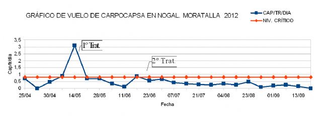 Los dos tratamientos realizados los pasados meses de mayo y junio, cuando las trampas con feromonas indicaban máximos de vuelo, han servido para controlar completamente la citada plaga, hasta el punto de no detectar ni una nuez agusanada. Esto contrasta, según Pedro Guirao, con los seis o siete tratamientos que es preciso realizar en cultivos intensivos de nogal o manzano para mantenerlos protegidos durante el período sensible, de mayo a septiembre, por parte de aquellos agricultores que desconocen el desarrollo del vuelo y los momentos óptimos de tratamiento.