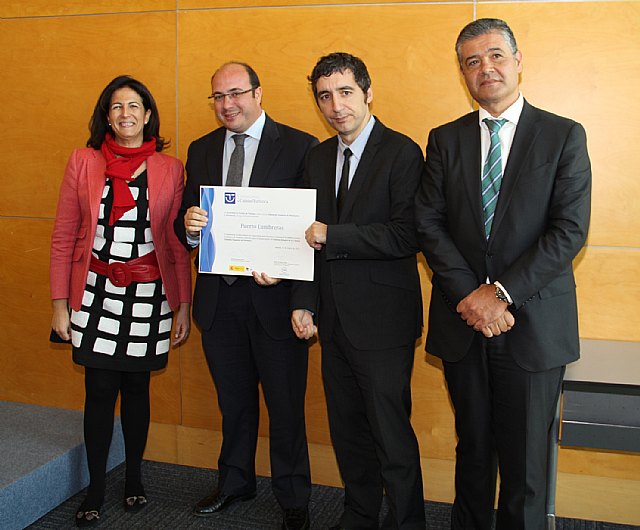 El consejero de Cultura y Turismo, Pedro Alberto Cruz, asistió hoy en la Feria Internacional de Turismo (Fitur) a la entrega del distintivo 'Compromiso de Calidad Turística' al alcalde de Puerto Lumbreras, Pedro Antonio Sánchez, en un acto presidido por la secretaria de Estado de Turismo, Isabel Borrego, en el que fueron reconocidos los destinos pioneros SICTED y las empresas distinguidas por los destinos que se incorporan por primera vez al programa.