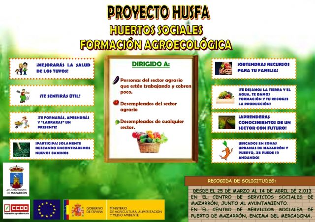 El Proyecto de Huertos Sociales "HUSFA" se ampliará a Puerto de Mazarrón y contará con un mayor número de huertos en Mazarrón tras la positiva experiencia que ha arrojó en el municipio el pasado año esta iniciativa pionera en la Región de Murcia, en la que diversas familias con necesidades pueden plantar sus propios productos hortofrutícolas para el autoconsumo. Así lo han dado a conocer esta tarde el Alcalde de Mazarrón, Ginés Campillo, la concejala de Política Social, María Martínez, y el responsable del proyecto y técnico de Servicios Sociales, Javier Díaz.