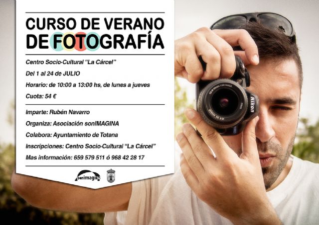 Dado el valor y la importancia que actualmente tiene la imagen y las artes visuales, la Asociación sonIMAGINA junto a la Concejalía de Cultura han organizado un curso de verano de Fotografía Digital impartido por Rubén Navarro en el Centro Sociocultural "La Cárcel", que se desarrollará del 1 al 24 de julio, de lunes a jueves de 10:00 a 13:00 horas. Se pueden inscribir todos los jóvenes a partir de 13 años con cámara fotográfica digital.