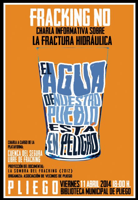 Miembros de la Plataforma "Cuenca del Segura Libre de Fracking" participan, este viernes 11 de abril, en un acto informativo en Pliego. Se proyectará el documental "La sombra del Fracking", y posteriormente se explicará la situación de los proyectos de fractura hidráulica que amenazan la región de Murcia, y también a la comarca en la que se ubica Pliego (cerca del permiso Acuario).