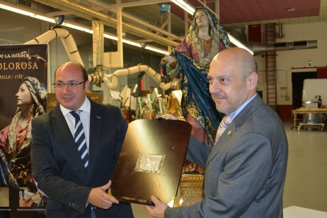 El consejero de Educación, Cultura y Universidades, Pedro Antonio Sánchez, hizo entrega hoy al presidente de la Cofradía del Santísimo Cristo de la Caridad, Antonio José García, y al párroco de la Iglesia de Santa Catalina, Julio García, del manuscrito hallado en la restauración de 'La Dolorosa' de Salzillo que ha permitido datar la obra en 1742, una década posterior a la estimada en varios estudios que indicaban su origen entre 1732-1735.