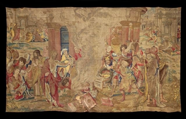 'San Pablo quemando libros paganos' es una pieza tejida en sedas e hilos de oro, fue encargada por el Rey Enrique VIII para su colección particular y se exponía en el Palacio de Hampton Court, en 1538. El tema era especialmente significativo para Enrique VIII, responsable de la ruptura de la iglesia anglicana con el poder de Roma, ya que la figura de San Pablo reforzaba la idea de la comunicación directa con Dios y, sobre todo, le ofrecía una alternativa a la supremacía de San Pedro en la iglesia romana.