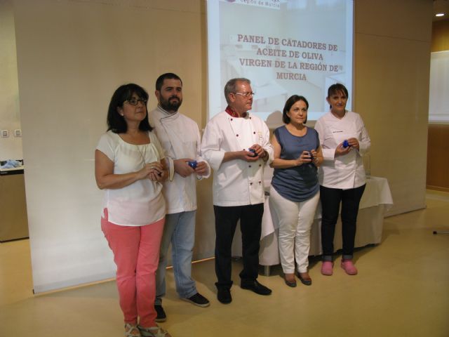 En la imagen, (de izquierda a derecha). La jefa del Panel Oficial de Catadores de Aceites Vírgenes de la Región, Carmen Teruel , el cocinero del restaurante 'A bombo y platillo', Paco Pellicer, el cocinero del restaurante 'Lagún', Pepe Alacid, la representante del Panel Oficial de Catadores de Aceites Vírgenes de la Región, Inma Muñoz, y la cocinera de 'La alacena de Ángela', Santi Hernandez, durante la VII jornada del Ciclo'Sabores de la Región de Murcia' que se celebró hoy en el Centro de Cualificación Turística y que incluyó catas y demostraciones culinarias en torno a los mejores aceites de oliva de la Región.