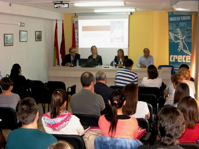 La directora del Instituto de Turismo, Mariola Martínez (2d), asistió hoy, junto al subdirector de la Escuela Universitaria de Turismo, Luis Hernández y el responsable de la asignatura de Restauración de la Escuela, Baltasar Abellán, a la presentación de la ponencia 'Salidas laborales en el mundo de la restauración.