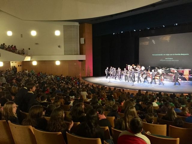 Unos 6.000 niños de un centenar de colegios de toda la Región pasarán por el Auditorio Víctor Villegas durante esta semana para asistir al tercero de los Conciertos Escolares que organizan la Consejería de Educación, Cultura y Universidades y la Orquesta Sinfónica de la Región. Entre lunes y miércoles se organizarán seis sesiones que estarán a cargo del grupo Kalimba Percussion y su espectáculo 'Percusionando: Un viaje con la familia Baquetín'.