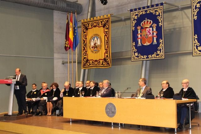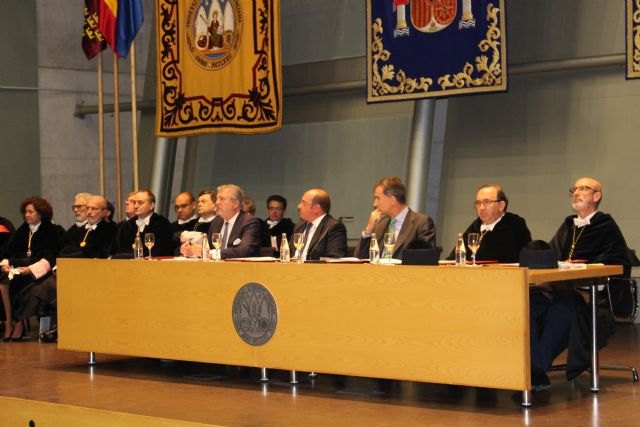Pedro Antonio Sánchez indicó que "la Región de Murcia aspira a estar en la vanguardia, a innovar y a crecer", y se refirió no sólo a la función de formación de la universidad sino también a su labor investigadora y a su contribución al desarrollo de empresas y entidades "con las que mantiene importantes vínculos que hemos de reforzar y ampliar para lograr que la etapa que tenemos ante nosotros sea la del éxito colectivo de toda una sociedad".