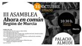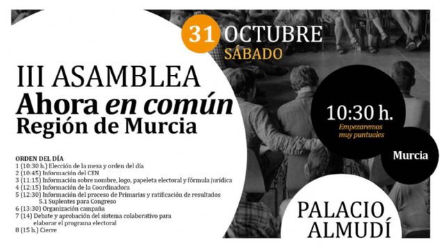 Ahora en Común-Región de Murcia celebra mañana en el Palacio Almudí de la capital su tercera Asamblea Regional, en la que, entre otros asuntos, se hará una rendición de cuentas del trabajo realizado hasta ahora y se abordarán asuntos relacionados con la campaña de las elecciones generales.