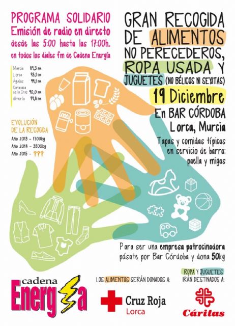 Además, durante ese tiempo Cadena Energía hará un programa solidario en directo animando a todos los oyentes a participar en dicha recogida.
