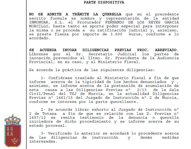 Ricardo Fernández recuerda en la noticia que “el querellante Núñez Arias lleva años reclamando la devolución de los 2,5 millones de euros que a través de la empresa Inmonuar entregó al Ayuntamiento de Totana por el plan urbanístico El Raiguero, para levantar un complejo residencial, que fue anulado por la justicia. En su denuncia, pone de relieve que el Ejecutivo regional habría creado el Ente Público del Agua con el fin de sortear o eludir la necesidad de que la Confederación Hidrográfica del Segura (CHS) autorizara los desarrollos urbanísticos en función de la disponibilidad de agua. Desde el citado ente, se certificaba la concesión de caudales procedentes de la desaladora de Escombreras. De esta forma, en al menos veintiséis ayuntamientos se habrían rubricado numerosos convenios que serían ilegales por carecer del preceptivo informe de la CHS. La firma de esos convenios habría reportado a los municipios unos 2.500 millones de euros”
