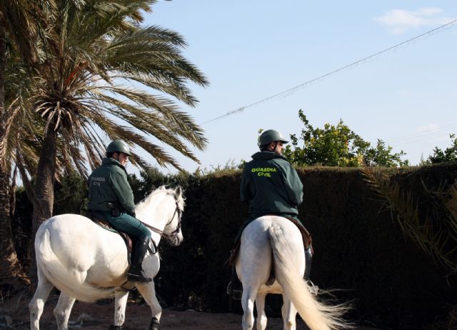 La Guardia Civil de la Región de Murcia ha reforzado los servicios establecidos para velar por la Seguridad Ciudadana en la Comunidad Autónoma con el apoyo del Escuadrón de Caballería del Cuerpo, que ya se halla prestando apoyo a los servicios enmarcados en el 'Plan contra las sustracciones en explotaciones agrícolas y ganaderas'.