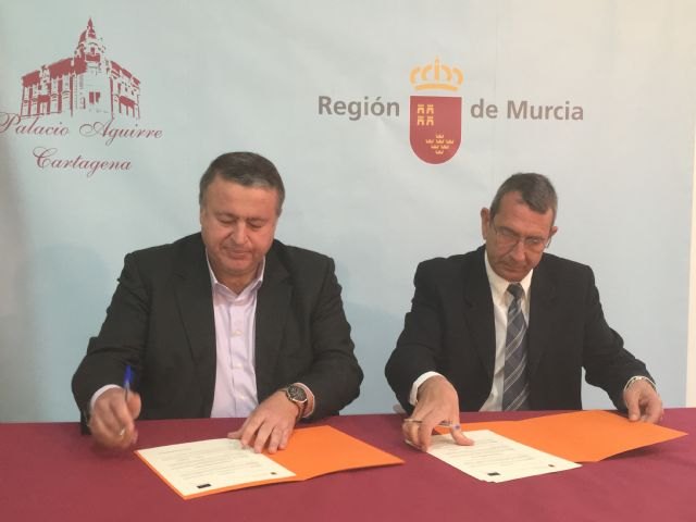 El consejero de Fomento e Infraestructuras, Francisco Bernabé, y el representante de Sánchez-Solé Ingenieros, Alfonso Sánchez Solé, firmaron hoy el contrato que permitirá la redacción del proyecto de creación de zonas de acceso diario para embarcaciones en el Mar Menor, por unos 28.000 euros.
