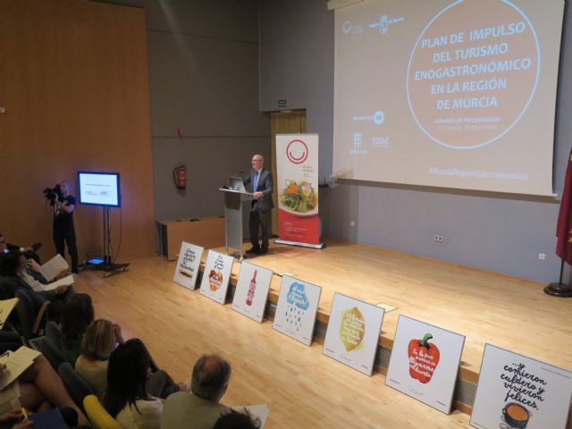 El consejero de Desarrollo Económico, Turismo y Empleo, Juan Hernández, durante la presentación al sector del nuevo plan destinado a convertir a la Región en referente enogastronómico.