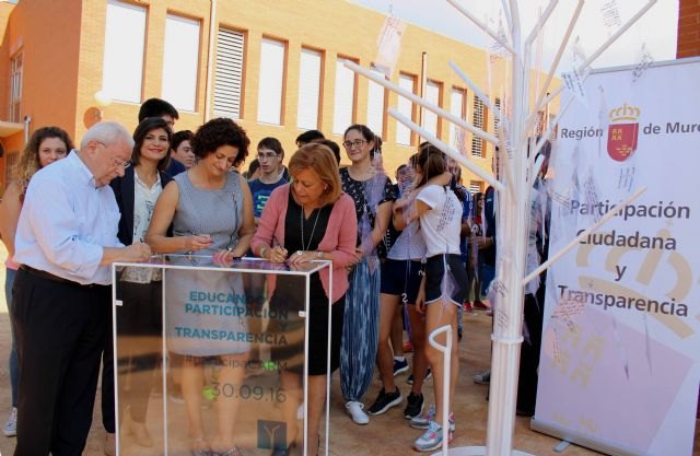 Así lo anunciaron las consejeras de Presidencia, María Dolores Pagán, y Educación y Universidades, María Isabel Sánchez-Mora, que, acompañadas por el presidente del Consejo de la Transparencia, José Molina, explicaron las medidas ante una cincuentena de escolares del IES Octavio Carpena Artés de Santomera, pionero en la conversión de su página web en un portal de transparencia educativo, a través de un proceso participativo.