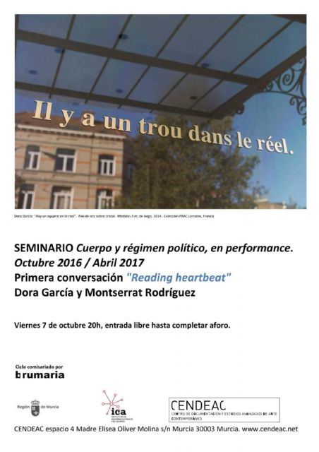 La primera sesión del ciclo 'Cuerpo y régimen político, en performance' tendrá lugar este viernes, a partir de las 20:00 horas, en el Cendeac. Se trata de la conversación 'Reading heartbeat', protagonizada por Montserrat Rodríguez y Dora García y que estará abierta a la participación del público.