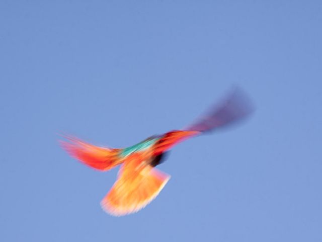 La artista murciana especialista en las técnicas de retoque fotográfico muestra una visión muy personal con la fuerza del movimiento, el color, la composición y el tema que refleja la felicidad en el aire de los palomos,aves que le acompañan desde su infancia y siempre le trasladan sensaciones de felicidad.