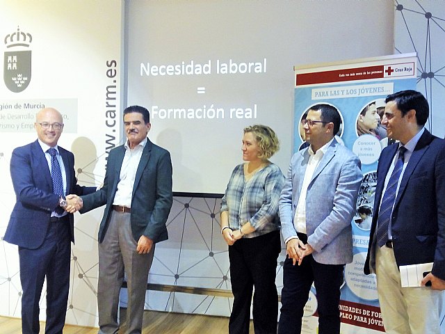 La Consejería de Desarrollo Económico, Turismo y Empleo ha rubricado hoy un protocolo de colaboración con Cruz Roja Española mediante el cual esta institución humanitaria se coordinará con el Servicio Regional de Empleo y Formación (SEF) para formar a 120 jóvenes beneficiarios de la Garantía Juvenil en profesiones específicamente demandadas en sus municipios.