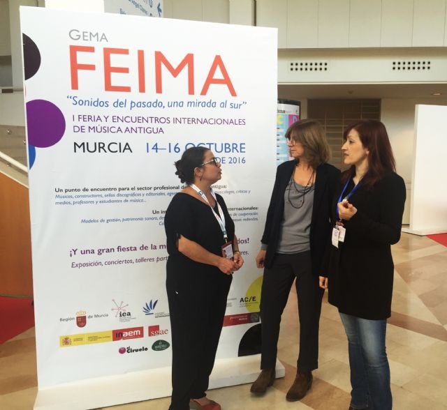 La directora general del Instituto de las Industrias Culturales y de las Artes (ICA), Marta López-Briones, junto con las responsables del grupo de música antigua 'La Tempestad' y coordinadoras de la feria, Silvia Márquez y Marivic Martín, visitó esta mañana las dependencias donde se monta la feria, que se inaugurará a las 16:00 horas y que ha sido organizada por la Asociación de Grupos Españoles de Música Antigua (GEMA), con el apoyo de la Consejería de Cultura y Portavocía y el Ayuntamiento de Murcia.
