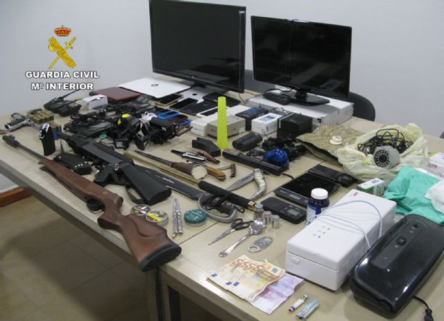 Los agentes se incautaron de 200 dosis de cocaína dispuesta para su inminente distribución y gran cantidad de efectos relacionados con el tráfico de drogas sustancia de corte, balanzas de precisión, máquinas de envasado, etc., 78.000 euros en efectivo, aparatos electrónicos dos televisiones, un lector DVD, dos ordenadores portátiles, cuatro tabletas, 11 teléfonos móviles, una cámara de fotos y un reloj, y gran cantidad de armas de todos tipo como una pistola semiautomática lista para su uso, con abundante munición de distintos calibres, 36 cartuchos 9 mm. y otros de 38 mm., dos pistolas eléctricas de defensa personal (táser), multitud de armas blancas repartidas por toda la vivienda y un fusil de asalto simulado.