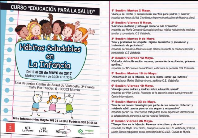 El Centro de Salud de Vistabella celebra entre los días 2 y 26 de mayo un curso de educación para la salud que abordará, a través de ocho charlas, los hábitos saludables en la infancia. El curso está dirigido a familias del ámbito geográfico de los barrios murcianos de La Paz, La Fama y Vistabella.
