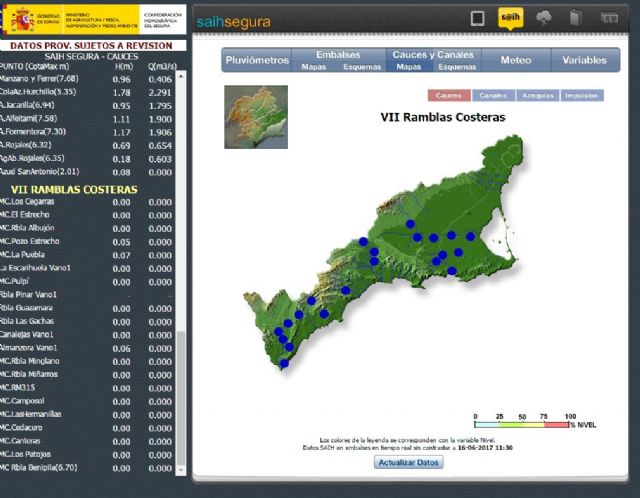 En total, el organismo de cuenca dispone de 162 puntos de control repartidos por toda la demarcación hidrográfica que ofrecen información en tiempo real que se actualiza cada cinco minutos. Los datos facilitados por el SAIH permiten la toma de decisiones mediante el seguimiento de las precipitaciones, la ejecución de maniobras en embalses y la supervisión de los niveles y caudales circulantes en cauces y canales, además de generar las alarmas que ayudan a mitigar los daños causados por avenidas e inundaciones.