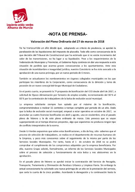 Desde IU-Verdes expusimos que sobre estas bonificaciones, a día de hoy, sólo sabemos que el proceso de selección de trabajadores, se realiza en el departamento de recursos humanos de la Empresa, y poco más conocemos sobre el seguimiento de la misma por parte de los Servicios Sociales Municipales. Por tanto, hasta el 1 de octubre de 2018 no se podrá comprobar el cumplimiento de los compromisos adquiridos por la empresa beneficiaria. Por ello, nuestro Grupo solicitó, formalmente, un informe de los Servicios Sociales Municipales sobre el proceso de selección y funcionamiento de esta bolsa y nos abstuvimos en la aprobación.