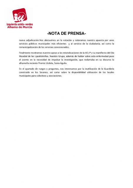 En el pasado pleno de febrero se aprobó iniciar la contratación del Servicio de Recogida, Transporte, Tratamiento y Eliminación de Residuos Urbanos y Limpieza Viaria. Sin embargo la actual concesionaria ha solicitado una nueva prórroga de un año en la prestación del servicio, que sería la cuarta de la cinco posibles. Acordando la denegación y la continuación hasta la nueva adjudicación.Nos abstuvimos en la votación y reiteramos nuestra apuesta por unos servicios públicos municipales más eficientes y al servicio de la ciudadanía, así como la remunicipalización de los servicios concesionados.