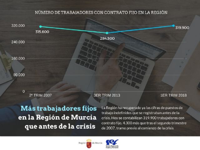 La Región de Murcia ha recuperado ya las cifras de puestos de trabajo indefinidos que se registraban antes de la crisis económica y de empleo. Según los últimos datos del Instituto Nacional de Estadística (INE), hoy se contabilizan en la Región 319.900 trabajadores con un contrato fijo, 4.300 más que a la conclusión del segundo trimestre de 2007, tramo previo al comienzo de la crisis, cuando eran 315.600.
