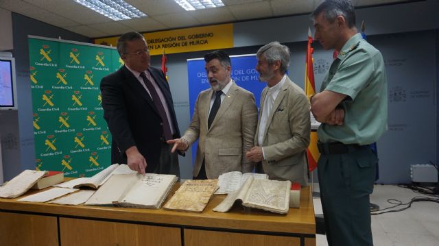 El director general de Bienes Culturales, Juan Antonio Lorca, asistió hoy a la entrega de documentos históricos recuperados por la Guardia Civil en el marco de la operación Index. Se trata de nueve volúmenes manuscritos y otros documentos de archivos históricos de la Región de Murcia y otras provincias.