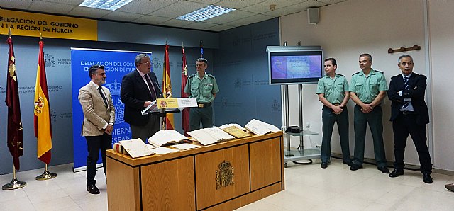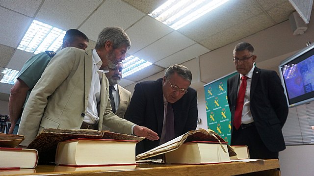 El delegado del Gobierno, Francisco Bernabé, el Coronel Jefe de la 5ª Zona, y el Director General de Bienes Culturales de la Comunidad Autónoma, Juan Antonio Lorca, en el marco del 'Plan para la defensa del Patrimonio Histórico Español', han presentado esta mañana una nueva operación de la Guardia Civil de la Región de Murcia, que, bajo el nombre de INDEX, ha culminado con la recuperación en Madrid de nueve volúmenes manuscritos y numerosos documentos de valor histórico datados entre los siglos XVI y XVIII y pertenecientes a distintos archivos históricos –municipales y eclesiásticos– de la Región de Murcia y de las provincias de Cádiz, La Rioja, Palencia y Valladolid, entre otras.