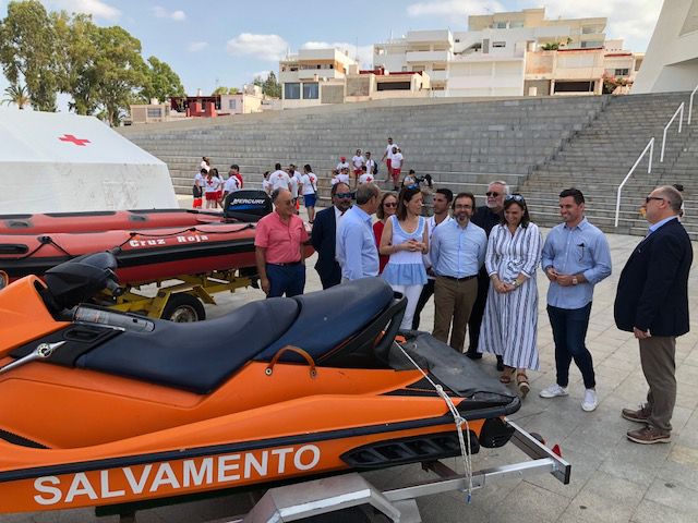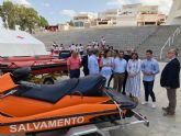 El consejero de Presidencia, Pedro Rivera, y la alcaldesa de Águilas, María del Carmen Moreno, presentaron hoy los efectivos que se despliegan en las playas de Águilas dentro del Plan COPLA, con 19 puestos, una silla de vigilancia, 37 socorristas, cuatro embarcaciones, cuatro kayaks y tres sillas para baño de personas con discapacidad. Además, se dispone de la embarcación de salvamento ‘Titania’, anclada en el puerto pesquero, servida por un patrón y dos socorristas; y un vehículo todoterreno y dos socorristas para intervención en playas no vigiladas.