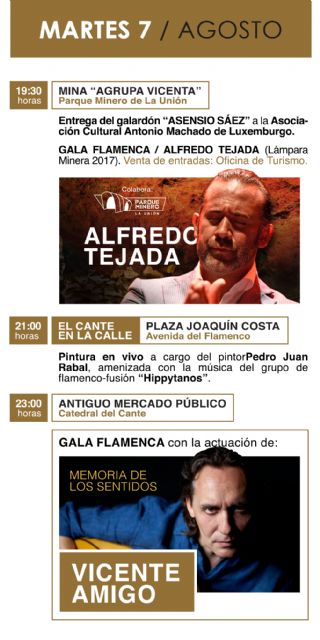 La jornada previa a las semifinales comenzará a las 19:30 horas en la Mina Agrupa Vicenta donde se hará entrega del galardón Asensio Sáez a la Asociación Cultural Antonio Machado de Luxemburgo. Tras esta entrega, tendrá lugar la esperadísima actuación de la Lámpara Minera 2017, Alfredo Tejada, en un entorno único y maravilloso como es la única mina visitable en la comarca de Cartagena.