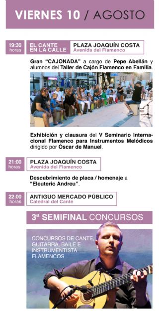 A las 19:30 horas comenzará la jornada con el Cante en la Calle. Tendrá lugar en la Plaza Joaquín Costa la gran Cajonada a cargo de Pepe Abellán y los alumnos del Taller de Cajón Flamenco. Tras ella los alumnos del V Seminario Internacional Flamenco para Instrumentos Melódicos harán una exhibición de todo lo aprendido dirigidos por Óscar de Manuel.