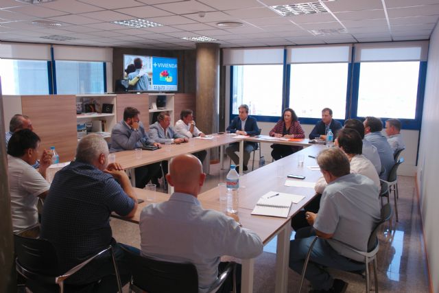La secretaria general de Fomento e Infraestructuras, Yolanda Muñoz, acompañada por el director general de Ordenación del Territorio, Arquitectura y Vivienda, José Antonio Fernández Lladó, presentó las novedades de este plan, que cuenta con una inversión total de 80 millones de euros, al presidente de la Asociación de Promotores Inmobiliarios de la Región de Murcia (Apirm), José Hernández, y su junta directiva.
