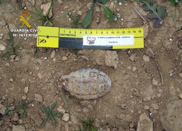 También fruto de la colaboración ciudadana, en este caso en El Carmolí, término municipal de Cartagena, un ciudadano halló una granada cuando paseaba por una zona de monte y alertó a la Guardia Civil.