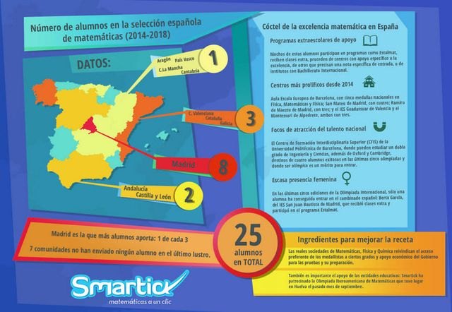 Niños con alta capacidad para las matemáticas bien estimulados y atendidos por una familia concienciada con el placer de aprender, profesores que tienen las expectativas más altas para ellos, programas específicos de apoyo y centros con políticas de soporte a la excelencia académica. Esos son algunos ingredientes del cóctel de la excelencia científica en España, en especial en matemáticas, según el análisis que ha realizado Smartick de los resultados de los alumnos en las últimas competiciones en ciencias.