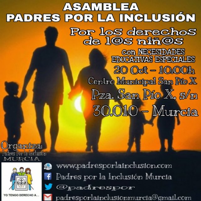 En la asamblea de mañana sábado, la Plataforma busca constituirse para servir de interlocutora en defensa de estas familias ante la Consejería de Educación. Tras una fase de acciones espontáneas, entre las que destaca la concentración del pasado día 8 ante las puertas de la institución, el objetivo ahora es dotarse de una estructura estable y unos representantes. Para garantizar la asistencia del mayor número posible de familias, han dispuesto hasta de un servicio de guardería. El acto, que culminará con la participación de diversas asociaciones del área de la diversidad y federaciones de AMPAs, tendrá lugar mañana sábado, de 10 a 14 horas, en el Centro Municipal de San Pío X (Murcia).