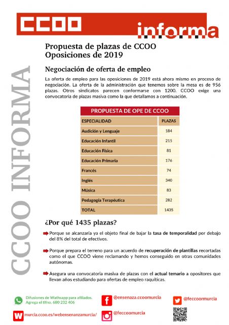 La propuesta del sindicato pasa por ofrecer 184 plazas en Audición y Lenguaje; 215 en Educación Infantil; 81 en Educación Física; 176 en Educación Primaria; 74 en Francés; 340 en Inglés; 83 en Música; y 282 en Pedagogía Terapéutica. CCOO Enseñanza ya ha manifestado su indignación por la actitud de la Consejería de Educación y del Gobierno regional que no tienen voluntad alguna en negociar la reversión de los recortes educativos de los que fueron adalides.