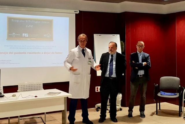 El director general de Salud Pública y Adicciones, José Carlos Vicente, inauguró hoy en el hospital Reina Sofía de Murcia el curso 'Manejo del paciente resistente a dejar de fumar', dirigido a profesionales que hayan realizado formación previa sobre Consejo Breve en Tabaquismo, responsables del programa de Enfermedad Pulmonar Obstructiva Crónica del Servicio Murciano de Salud, así como los responsables del programa Argos de prevención del consumo de alcohol y otras drogas que se desarrolla en el ámbito sanitario.