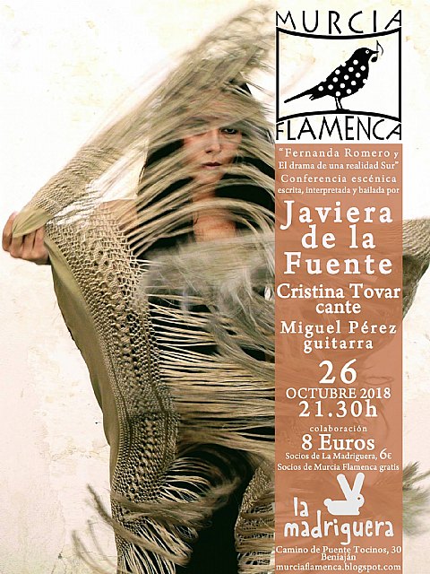 Viernes 26 de octubre a las 21.30 horas en La Madriguera. Camino de Puente Tocinos, 30. Beniaján. Murcia. 8€. Socios de la Madriguera 6€. Socios de Murcia Flamenca gratis
