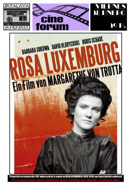 En memoria del 100° aniversario de la muerte de Rosa Luxemburg ,una figura histórica universal, el Club Atalaya ha programado la proyección de "Rosa Luxemburg" para el viernes 18 a las 19 horas.