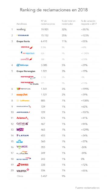 Vueling fue la aerolínea más reclamada en 2018 en reclamador.es, con más de 19.900 reclamaciones iniciadas en la web, lo que significa el 32% del total de las reclamaciones a aerolíneas registradas en la compañía online durante el pasado año. La low cost catalana desbanca así a Ryanair de la primera posición del ranking elaborado anualmente por reclamador.es. La compañía integrada en el Grupo IAG vuelve a la primera posición de la tabla, la cual ya ocupó en el año 2016.